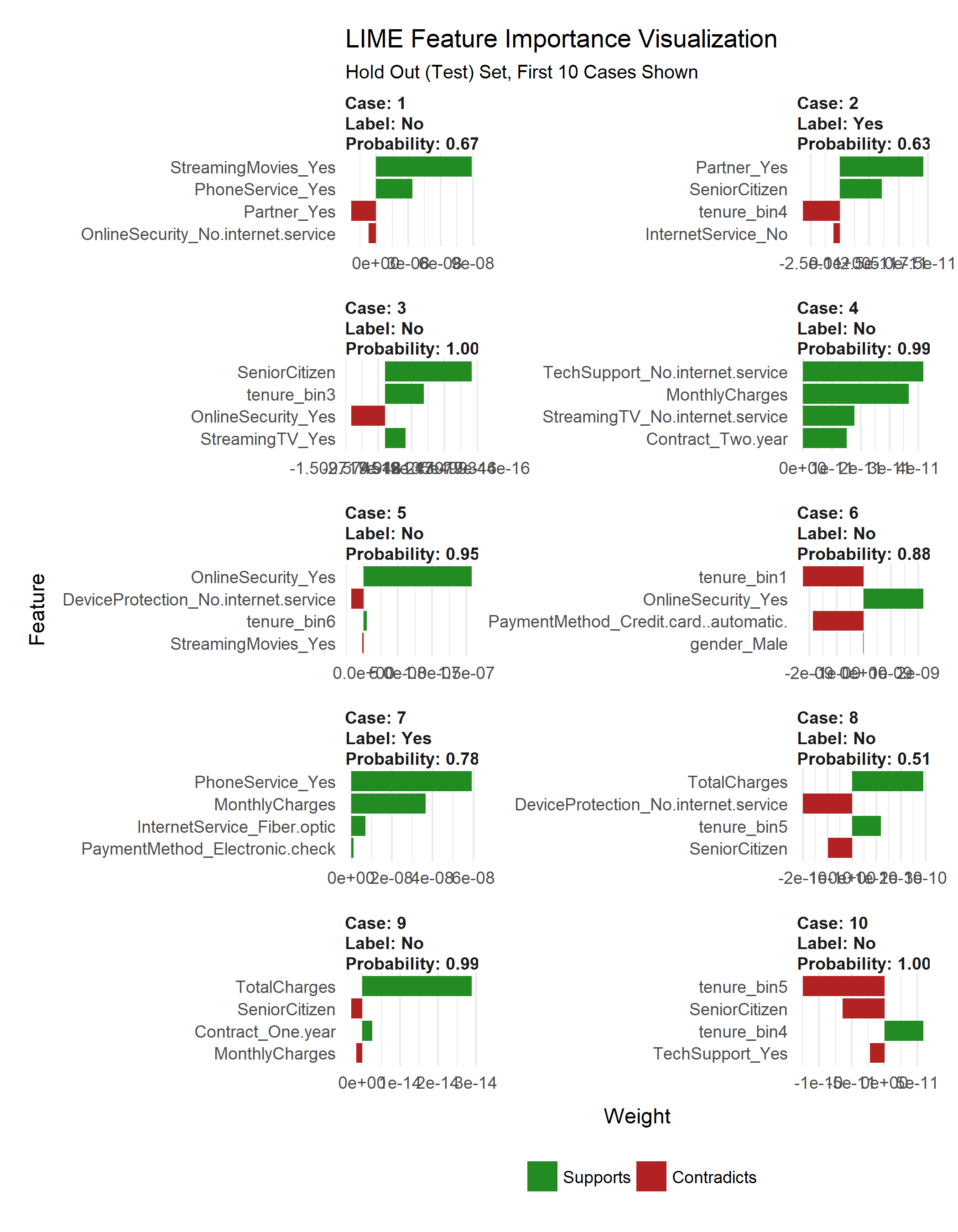 While LIME did not indicate this as a primary feature in the first 10 cases, the feature is clearly correlated with those electing to stay. Customers with fiber optic service are more likely to churn while those with no internet service are less likely to churn. Improvement Area: Customers may be dissatisfied with fiber optic service.