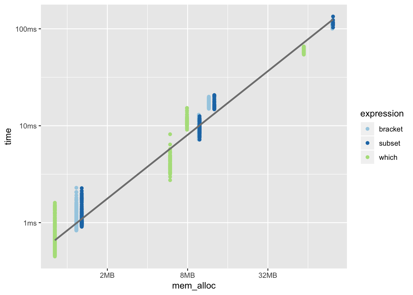 #> 2 dat[which(dat$x > 500), ] 230µs 281µs 259µs 1.12ms 3563. 357KB 52 1156 324ms