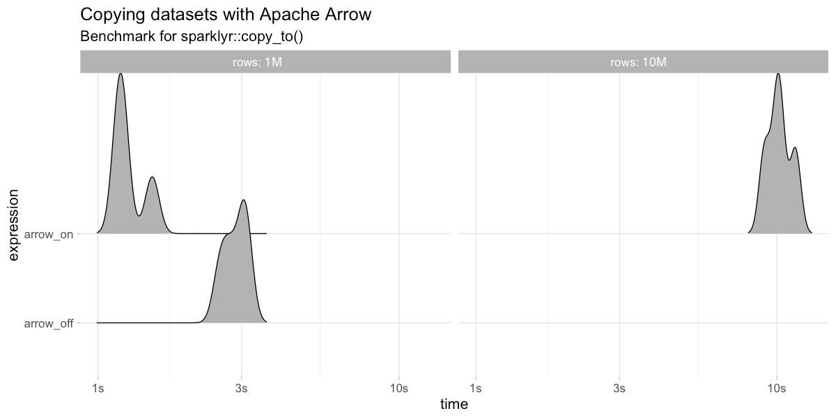 In practice, this means faster data transfers and support for larger datasets; specifically, this improves collect(), copy_to() and spark_apply(). The following benchmarks make use of the