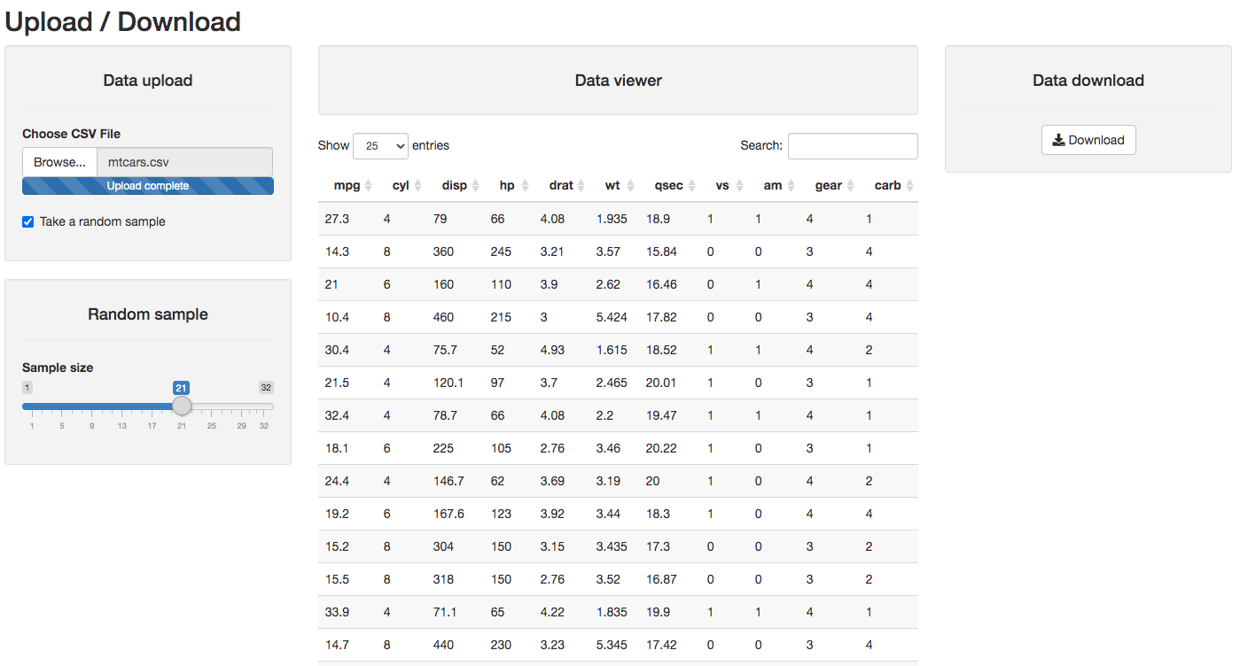 - On the left hand side the user can upload a CSV file, and has the option to randomly sample observations from the data file you uploaded. If the user checks this option, a new widget where the sample size can be set pops up. The minimum allowed sample size is 1 and the maximum allowed is 32.