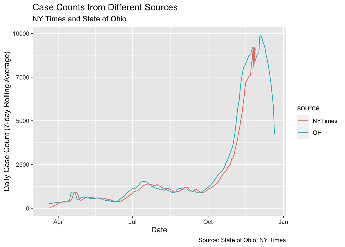 How comparable are these data sets? Let’s compare the NY Times case count and dates to the Ohio “Illness Onset” dates.