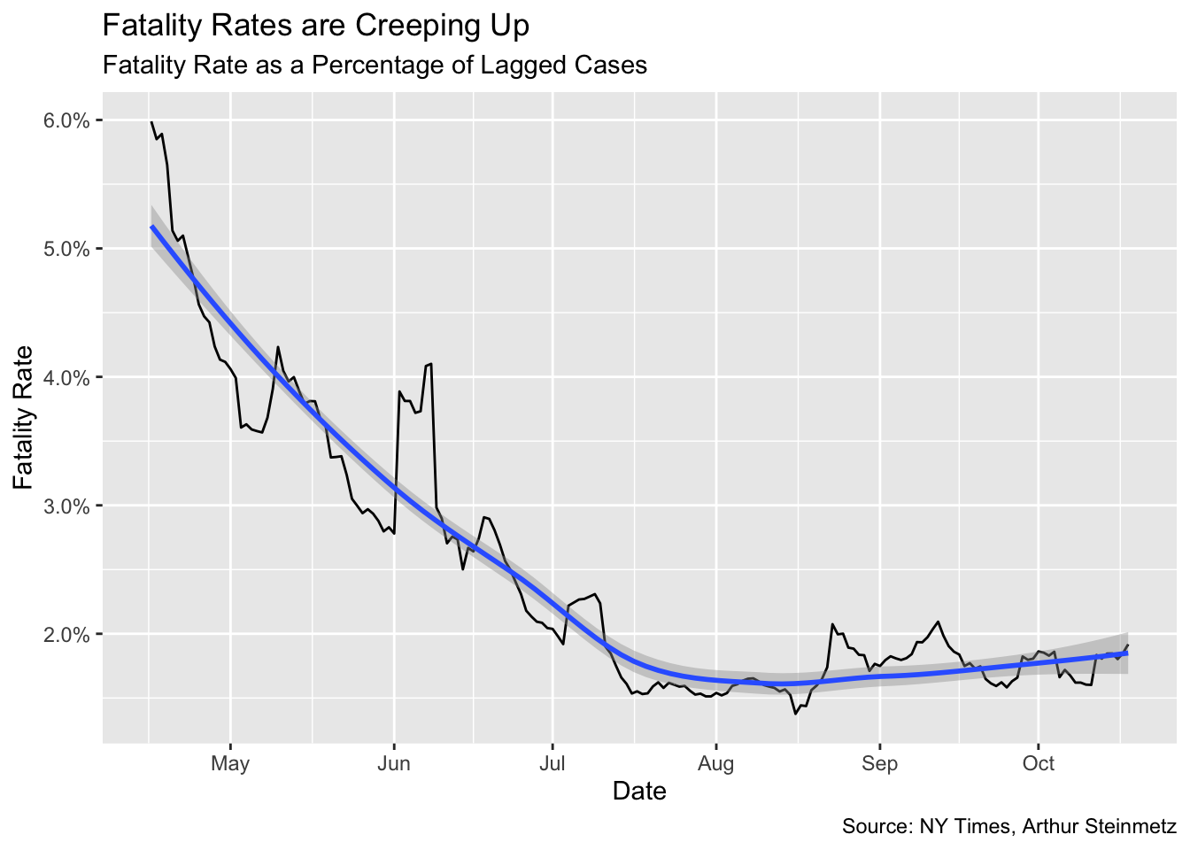 Among the vexing aspects of this terrible pandemic is that we don’t know what the gold standard is for treatment and prevention. We are learning as we go. The good news is we ARE learning. For a data analyst the challenge is the evolving relationship of of all of the disparate data. Here we have gotten some insight into the duration between a positive test and mortality. We can’t have high confidence that our proxy model using aggregate cases is strictly accurate because the longitudinal data from Ohio shows a different lag. We have clearly seen that mortality has been declining but our model suggests that death will nonetheless surge along with the autumn surge in cases.