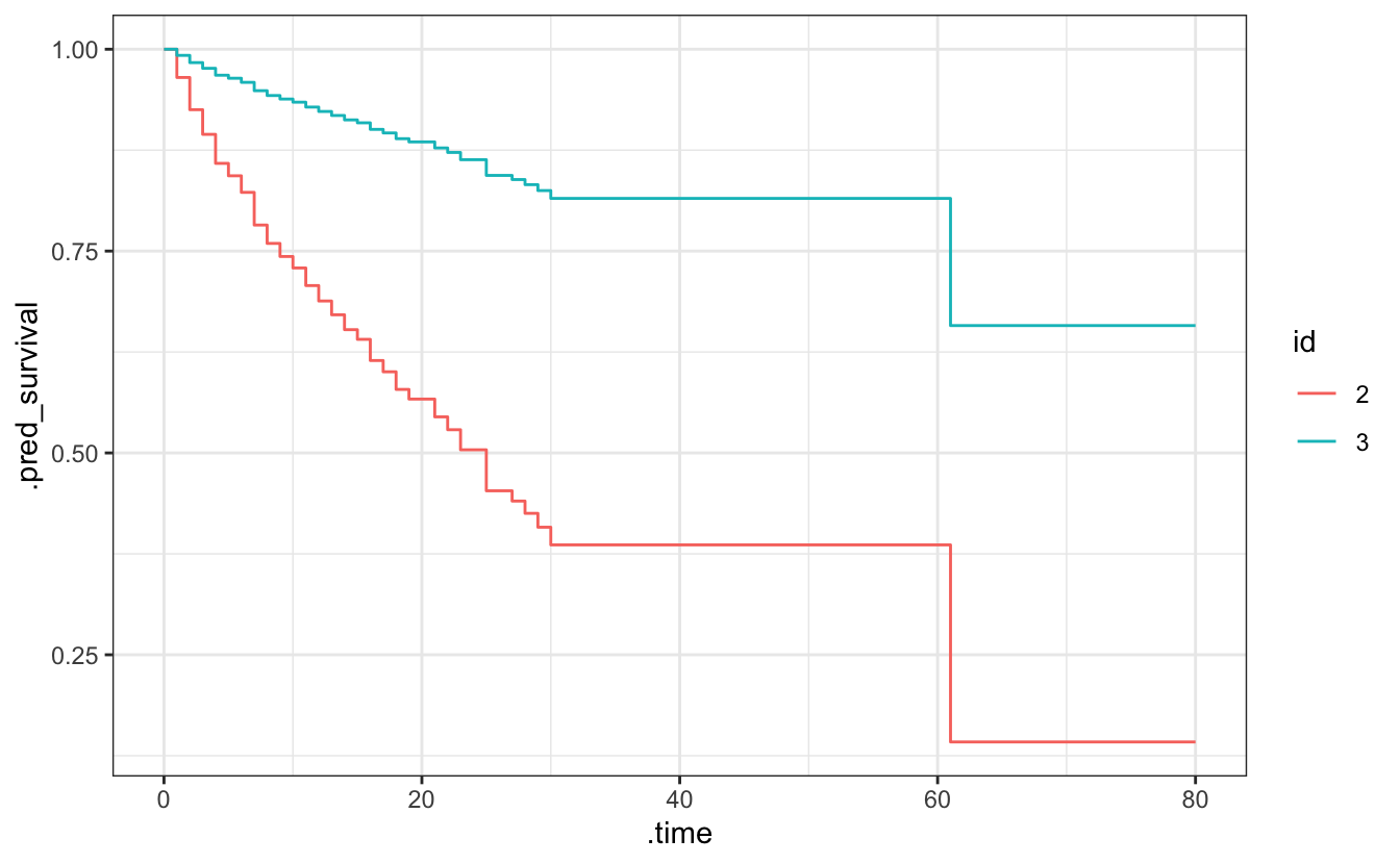 ggplot(aes(x = .time, y = .pred_survival, col = id)) +