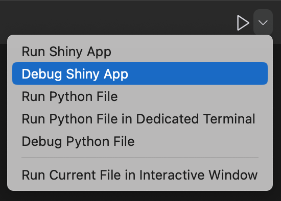 The Shiny extension for VS Code now lets you run your Shiny apps using the VS Code debugger. This lets you set breakpoints, debug on error, and step through your application code using VS code. To activate it, click the dropdown menu next to the Play button and select “Debug Shiny App”. To learn more about how to use the VS Code debugger, check out the VS Code documentation .