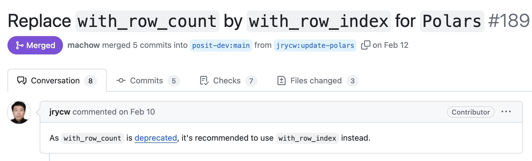 For example, Jerry’s first PR was ensuring we handled a Polars deprecation correctly.
