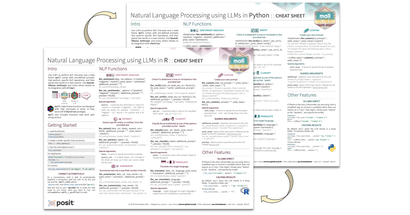 The brand new official cheatsheet is now available from Posit: Natural Language processing using LLMs in R/Python . Its mean feature is that one side of the page is dedicated to the R version, and the other side of the page to the Python version.