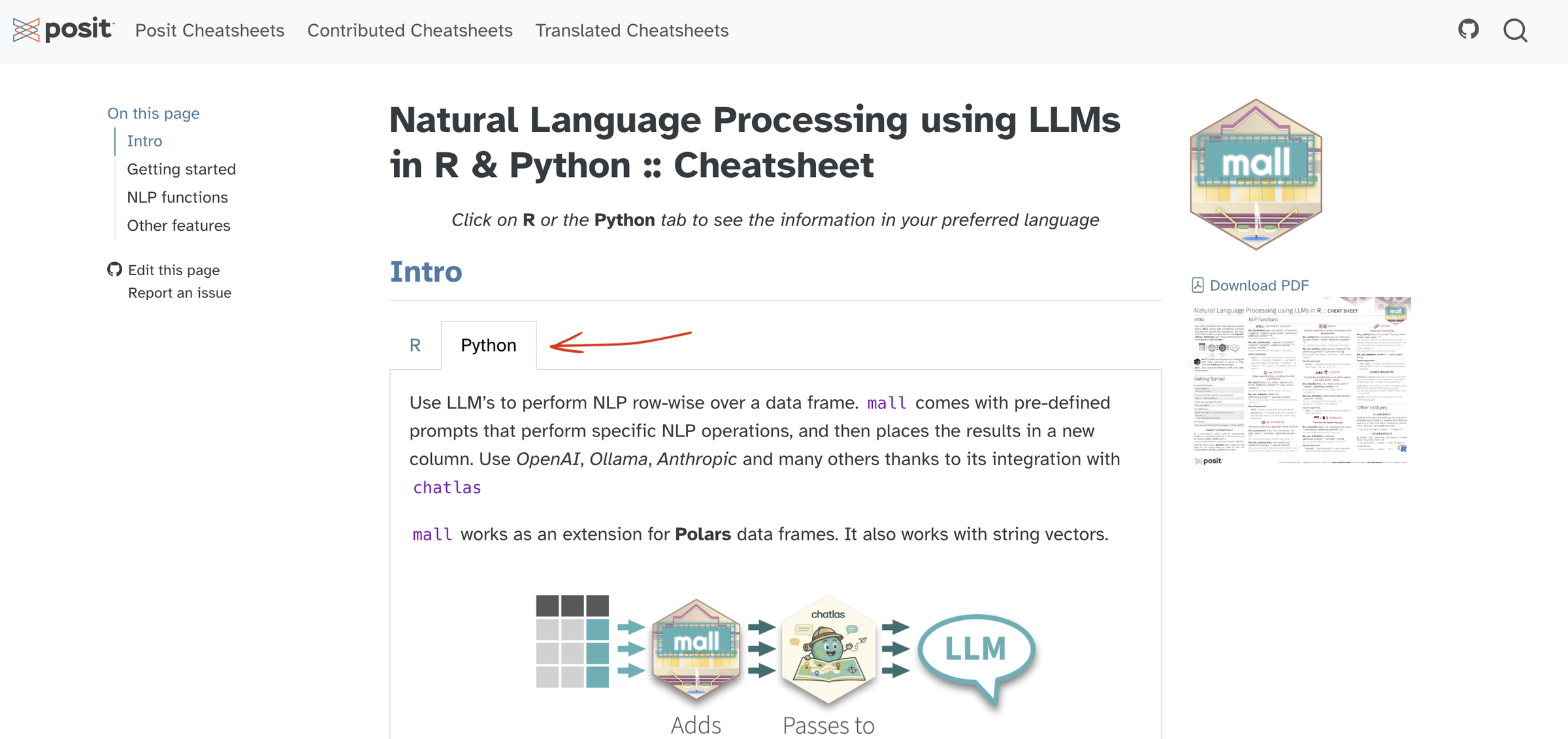 An web page version is also availabe in the official cheatsheet site here . It takes advantage of the tab feature that lets you select between R and Python explanations and examples.
